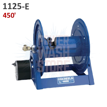 12V 1/3HP MOTOR 1125 Series Reel holds 450′ of 3/8″ or 325′ 1/2″ high pressure hose. Temps up to 225°F.