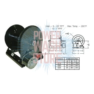 Hosetract 12v powered hose reels eliminate arm fatigue and speed up cleanup time. Holds 350′ of 3/8″ hose and 275′ of 1/2″ hose.