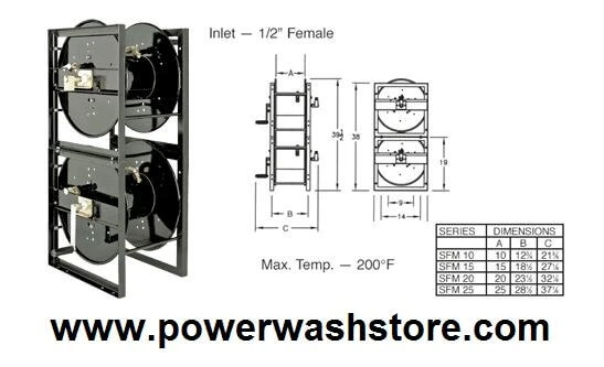 Hosetract hose reels have a stack capability with no added parts required. Holds 250′ of 3/8″ hose or 175′ of 1/2″ hose.