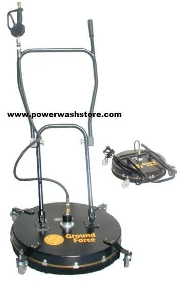 Easy storage and flexibility. This 24″ diameter surface cleaner is made from heavy-duty aircraft-grade aluminum for extreme durability. Equipped with 4 heavy-duty casters the Ground Force is easy to move in any direction. The Whisper Wash Ground Force has a flip-and-fold handle for easy storage and is equipped with a durable nylon skirt, 4,000 psi rotary head rated to 212°F and flows to 10gpm. The heavy-duty arms spin at speeds up to 2500 rpm for even and fast cleaning.